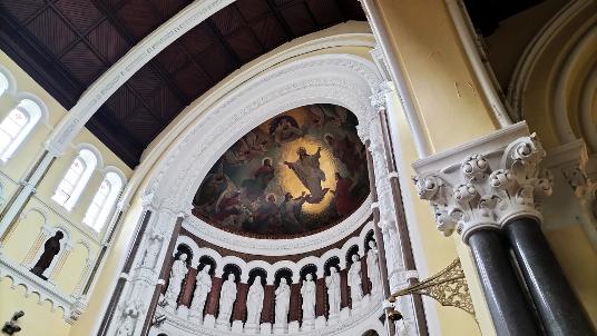 Decoration of the Apse and the lifelike statues of the apostles, (and the 12 nicles and 5 mysteries of the Rosary), and the stained glass windows of the Immaculate Virgin, presented by the late Mr E Phelan, T.C, (16 Mitchel St, Grocer and spirit shop)